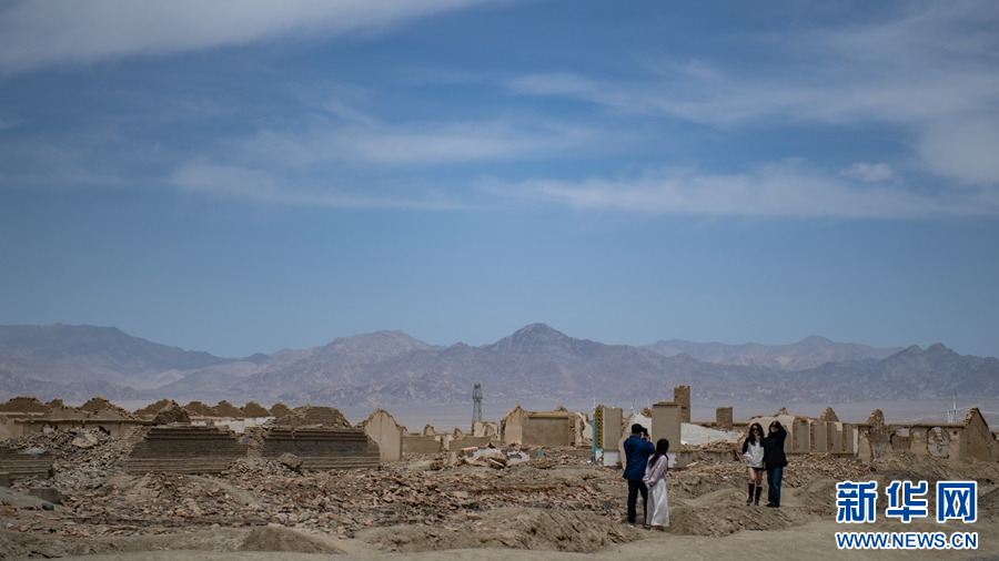 游客在冷湖石油工业遗址拍照留念。