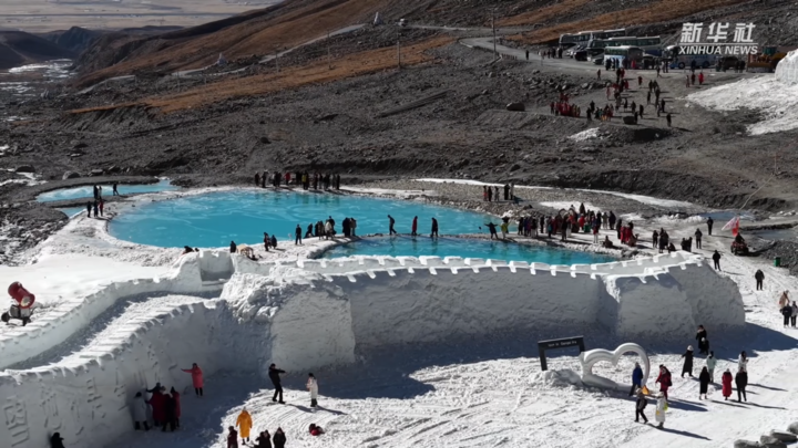春节期间,岗什卡雪峰景区游人如织,人们踏着皑皑白雪登高望远,感受冰雪豪情与新春喜悦。